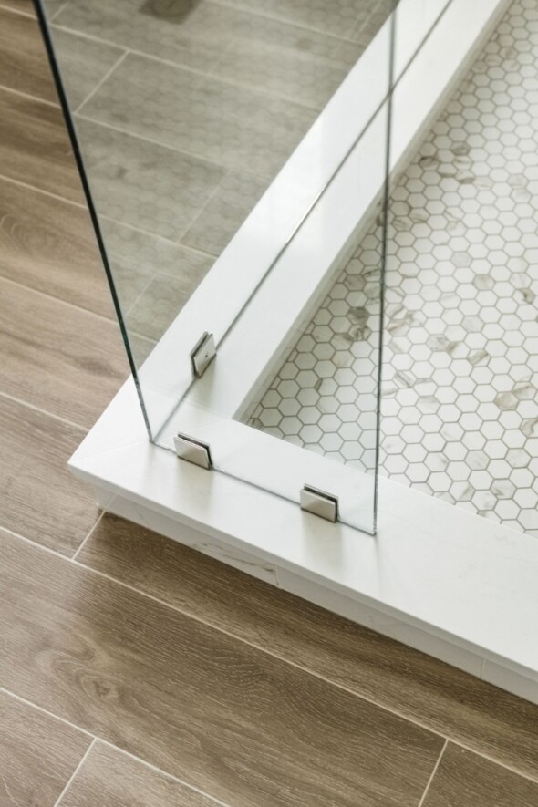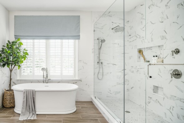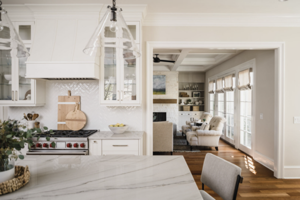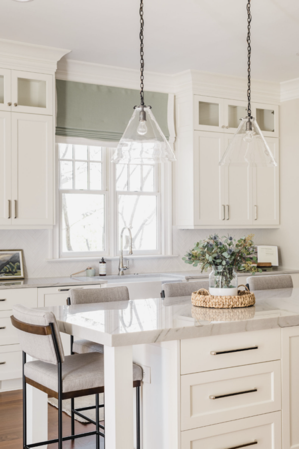 “We worked on this design project together with Watershed Builders in two phases at the request of our clients. Phase one consisted of renovating their primary bathroom and basement kitchen, and in phase two we renovated their main kitchen and fireplace and built-ins in their family room. Our clients wanted to have a functioning kitchen during each phase of their project to make living through the renovations more manageable” says Jena.